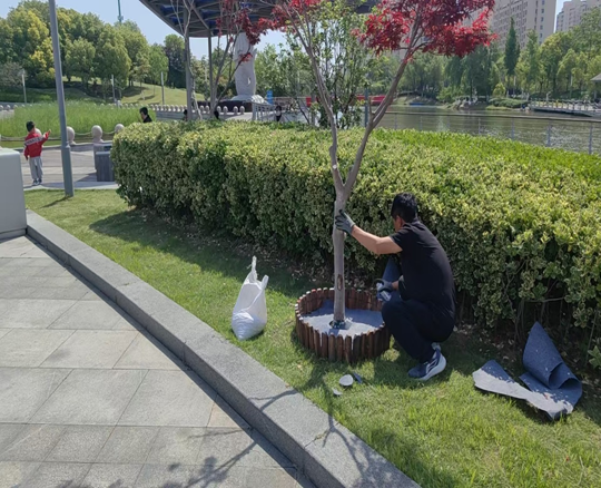 在施工現(xiàn)場(chǎng),養(yǎng)護(hù)人員將回收木樁截取統(tǒng)一長(zhǎng)度,精心配色組合使用環(huán)保彩漆涂刷橫截面,將原本單調(diào)的樹穴打造為充滿藝術(shù)氣息的“五彩景框”,顯著提升了公園整體景觀效果。